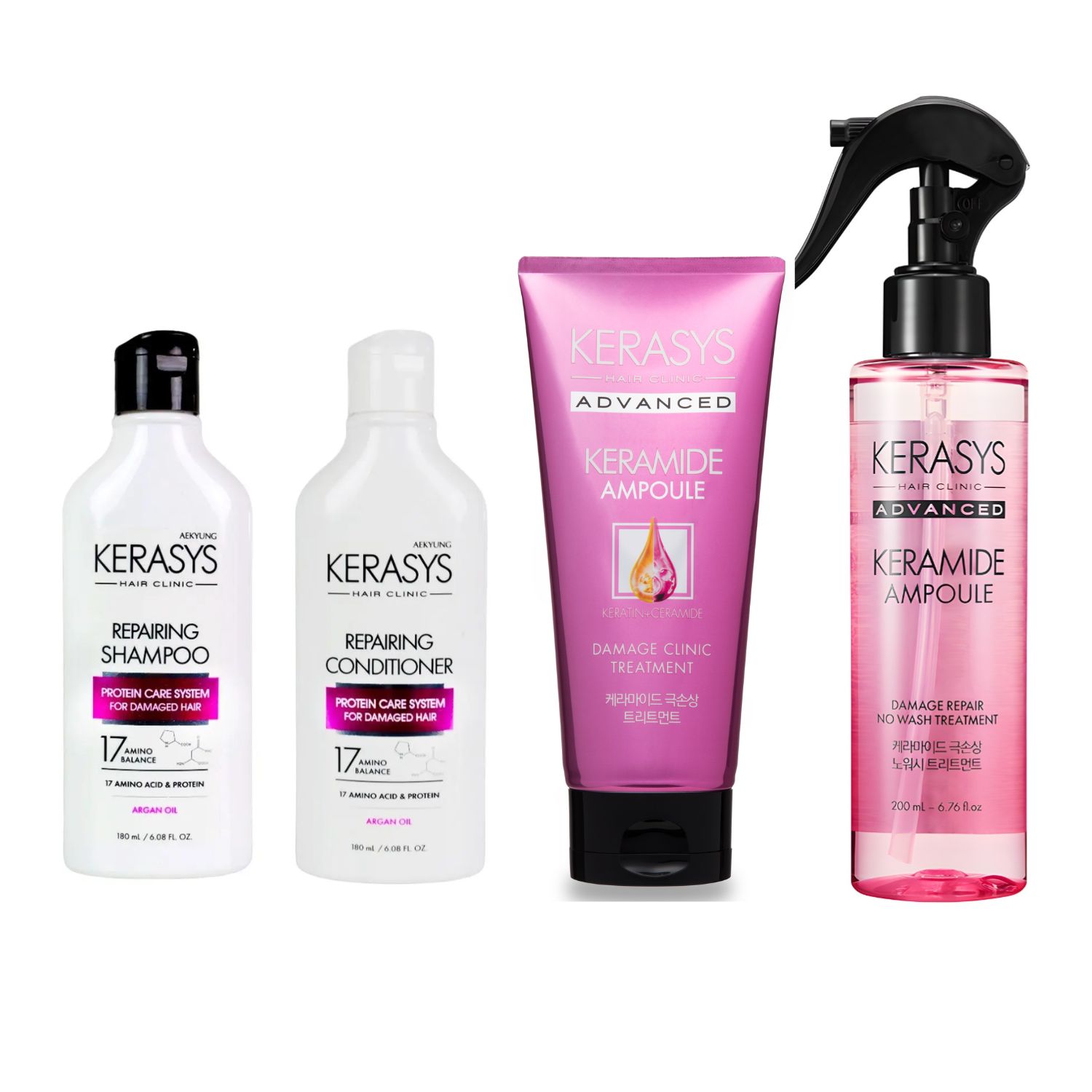 1 No Wash Keramide 200ml: Tratamento em spray sem enxágue para cabelos danificados e fragilizados por químicas, calor e agressões externas. Combina ceramida, queratina, complexo de 5 proteínas, 5 óleos nutritivos e extrato patenteado de Stellaria media. Proporciona maciez imediata, brilho e proteção térmica até 200 ºC.